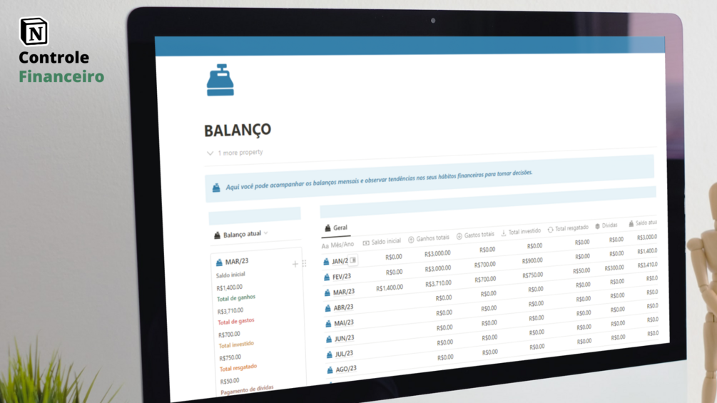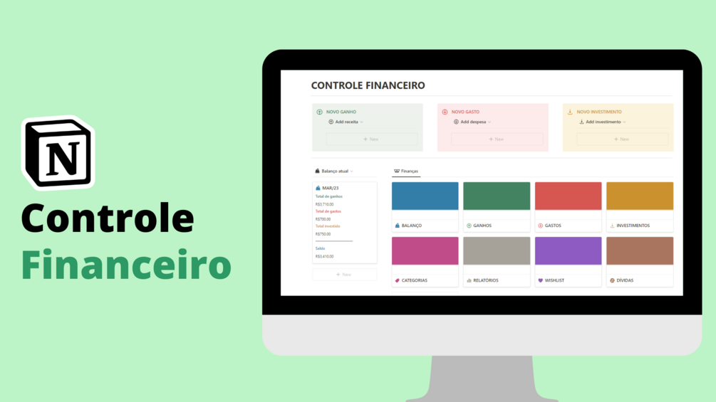 Com o template Controle Financeiro é simples acompanhar seus ganhos, gastos e investimentos e ter uma visão geral das suas finanças!